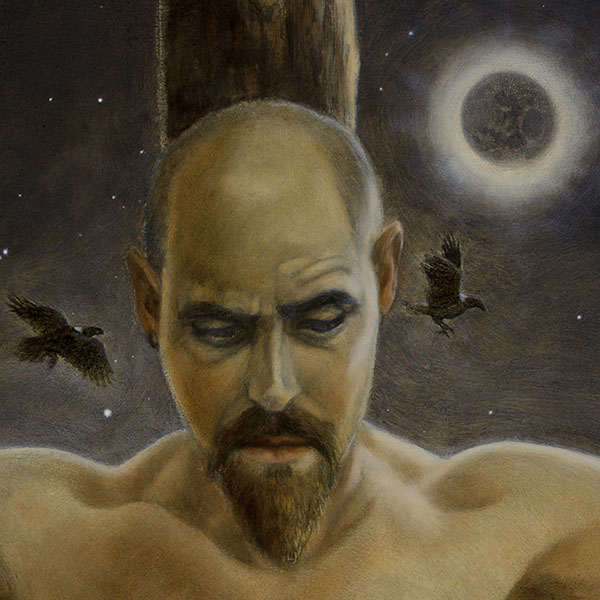 Nigredo, the ravens, Huginn and Muninn, oil on board, Damian Osborne, 2021.
